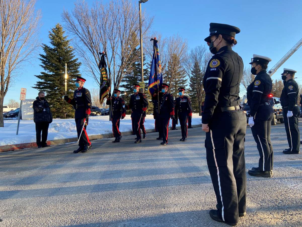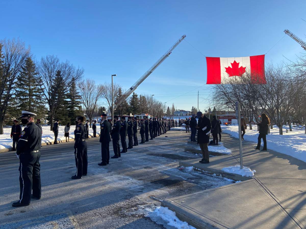 Officers in regimental uniforms, including Mounties in Red Serge, wore masks and stood two metres apart on the sides of the police headquarters driveway, casting long shadows in the light of a winter afternoon.