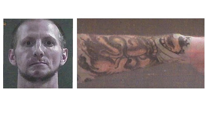 A photo of Terrance Allan Jones, and one of his right arm, which is heavily tattooed. Kamloops RCMP