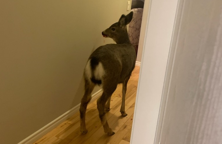 “There was a deer in our house,” Mason said, adding the young animal appeared to have squeezed its way through a dog door.