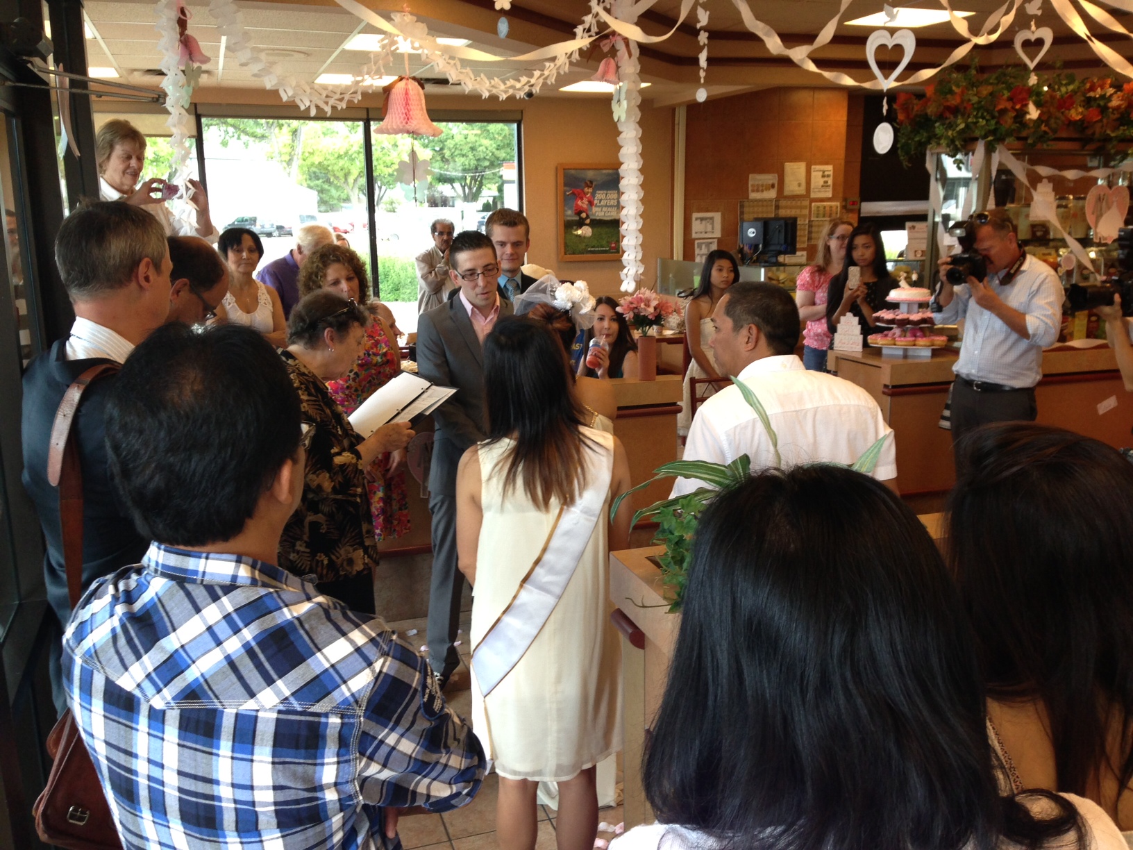 Friends and family stood on one side of the restaurant and customers on the other. With so much support, they hope their life will have a ‘double double’ amount of love.