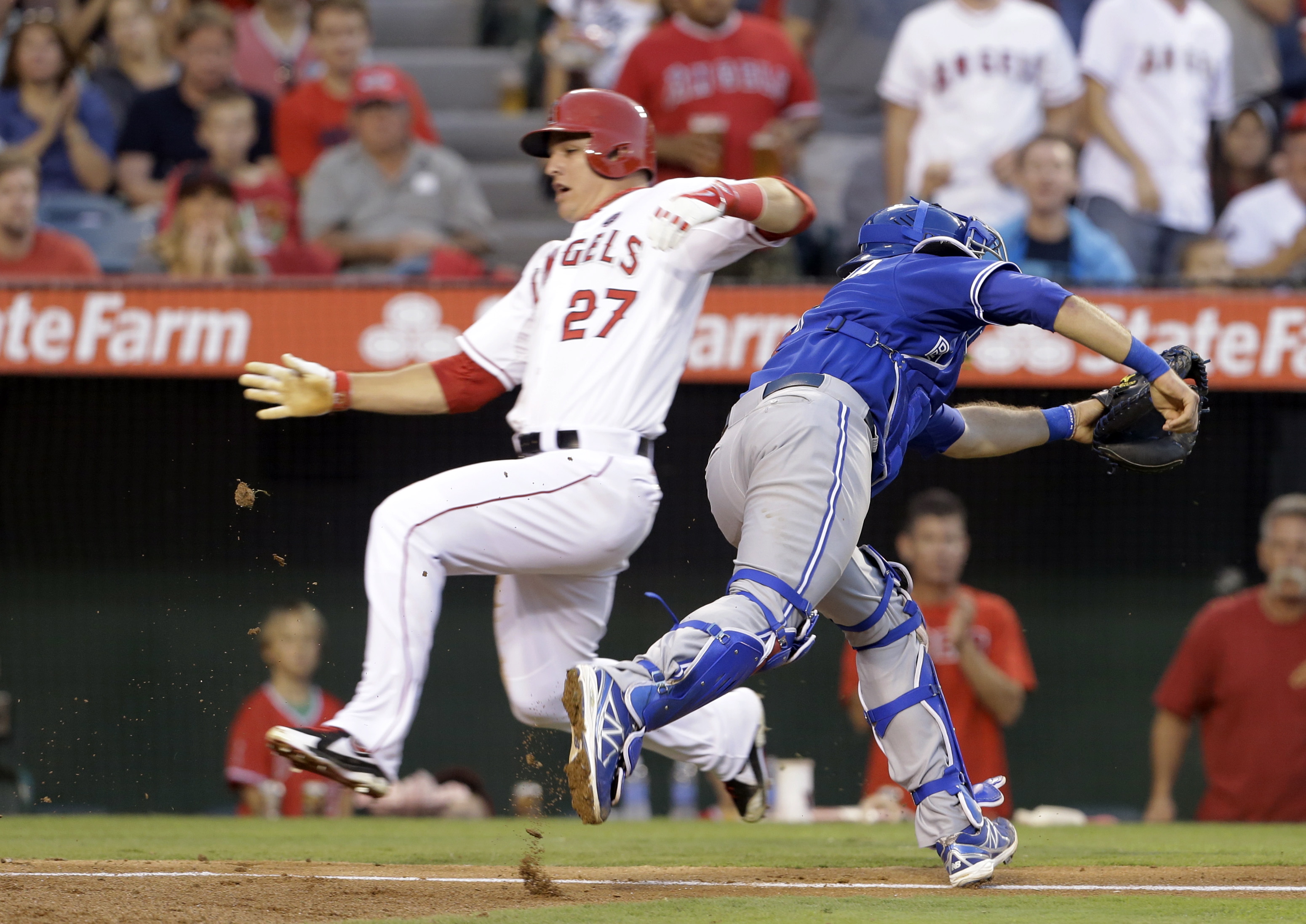Rogers hit Trout on the left arm two pitches later before giving up a single by Josh Hamilton and a run-scoring single by Howie Kendrick. Center fielder Colby Rasmus made a wide throw to the plate trying to get Trout, and catcher J.P. Arencibia threw to second trying to nab Kendrick – but his throw sailed over Reyes and skipped between Rasmus and right fielder Jose Bautista, allowing Hamilton to score and Kendrick to circle the bases.