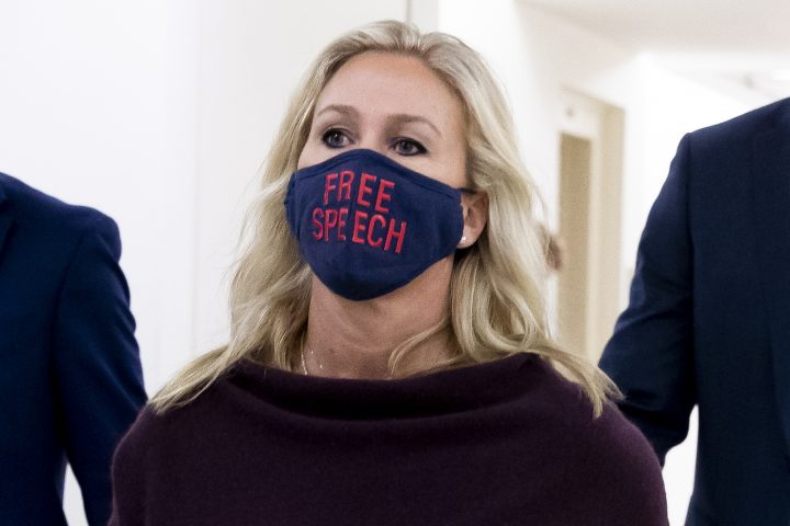 Yet in a riveting moment, the freshman Republican from a deep-red corner of Georgia took to the House floor on her own behalf. She offered a mixture of backpedaling and finger-pointing as she wore a dark mask emblazoned with the words “FREE SPEECH.”