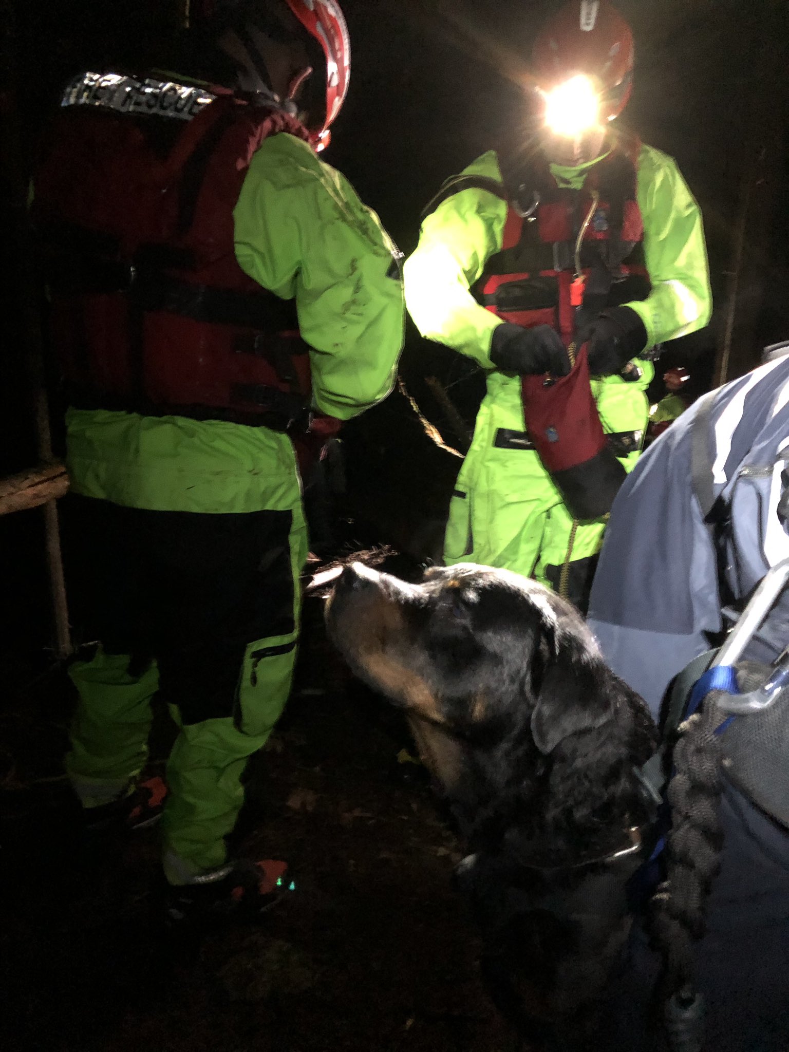 Swift-water specialists dove into the fast-flowing water to reach Boss, who was waiting on a ledge.