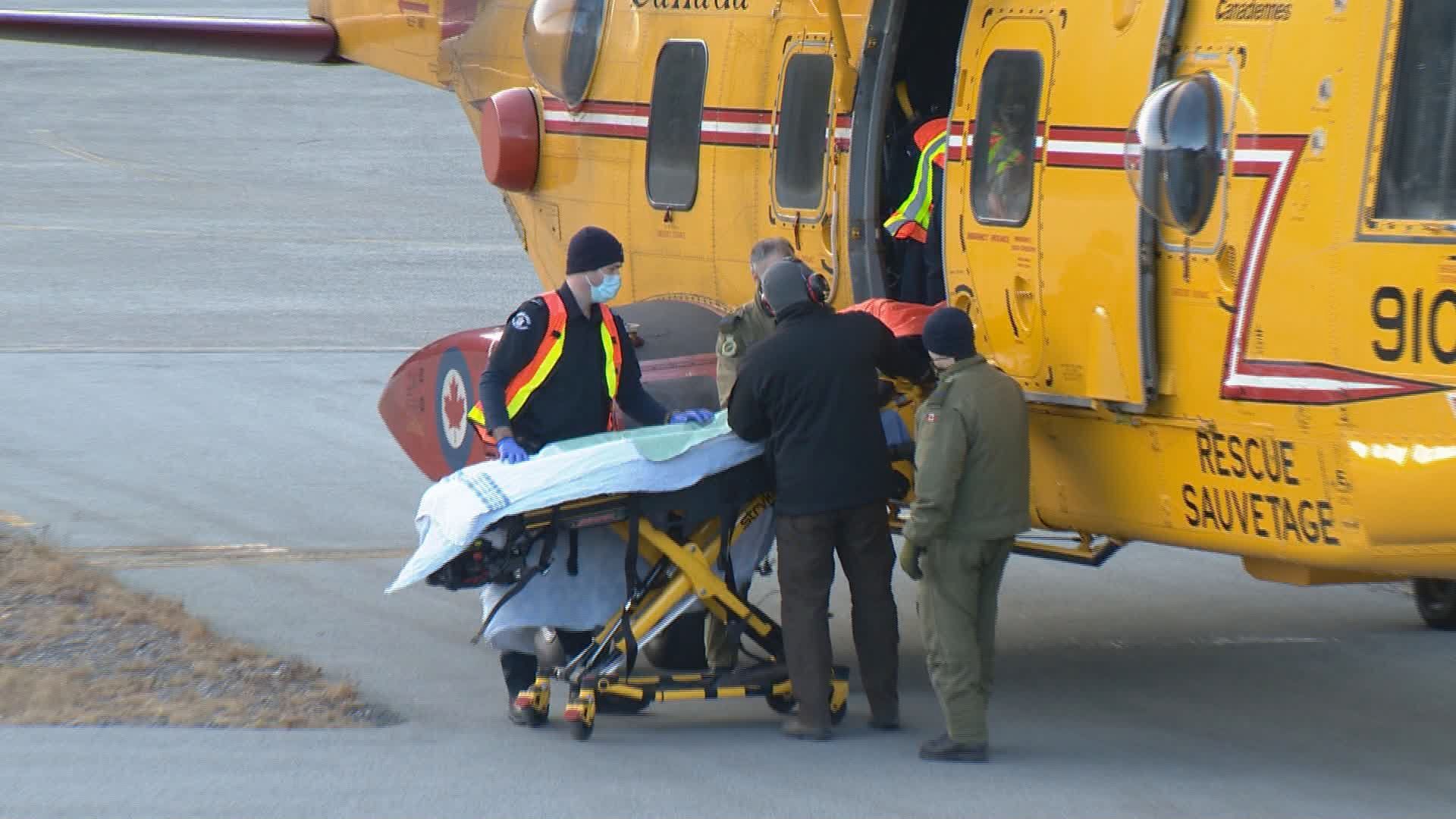 A military search-and-rescue helicopter arrives at an airfield in Squamish after rescuing two men from the backcountry following an avalanche. Global News