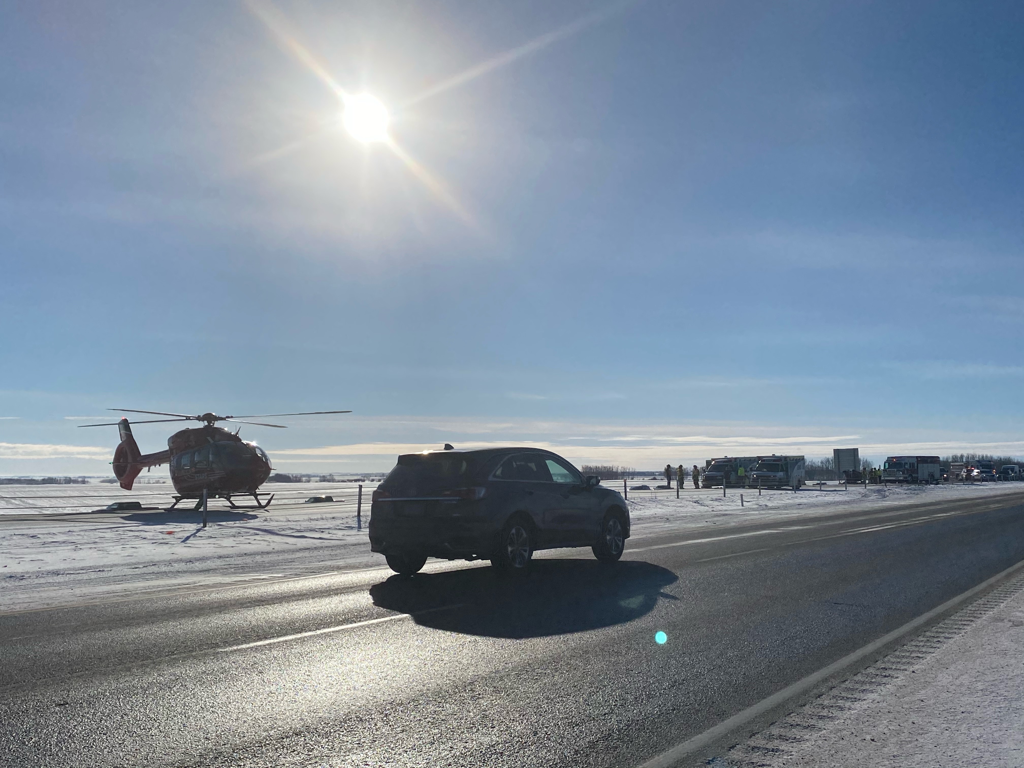 The 19-year-old man driving the SUV was airlifted by STARS to hospital with life-threatening injuries. The 19-year-old male passenger was taken to a local area hospital by EMS as a precaution, according to RCMP.