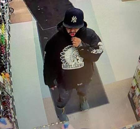 The wanted man was wearing a black “Hustlegang” sweatshirt, a dark New York Yankees baseball hat, a black facial covering, and grey boots.