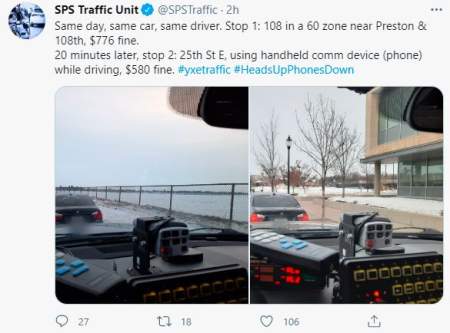 Saskatoon Police Service traffic unit tweeted that a driver had been stopped and ticketed two times on the same day, only 20 minutes apart. The fines amount to $1,356.