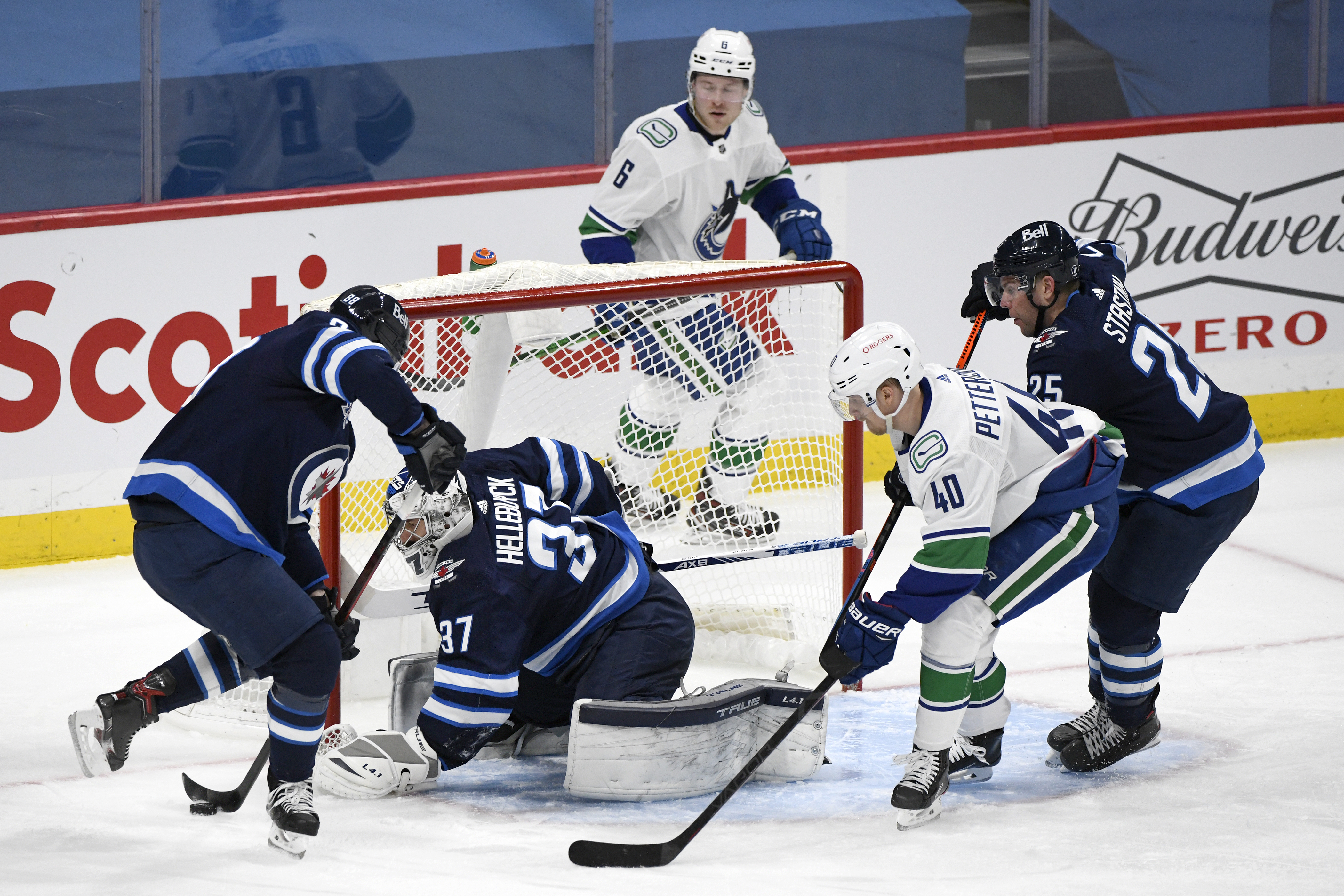 Rookie Nils Hoglander scored the Canucks’ third deflected goal of the period on the games first power play, after tipping a shot from former Jet Tyler Myers.