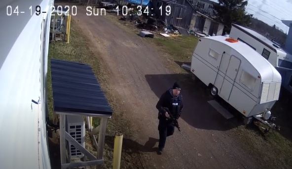 Surveillance video taken at the Onslow Belmont Fire Brigade hall shows two RCMP officers who fired their semi-automatic weapons at a man they mistakenly believed was the Nova Scotia gunman.
