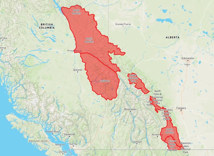 In a news release, the Alberta government said the warning would stay in effect “through the weekend” and applies to Waterton, Jasper, Banff, Yoho and Kootenay national parks, Kananaskis Country, the South Rockies, the North Rockies, the Cariboos, Lizard and Flathead.