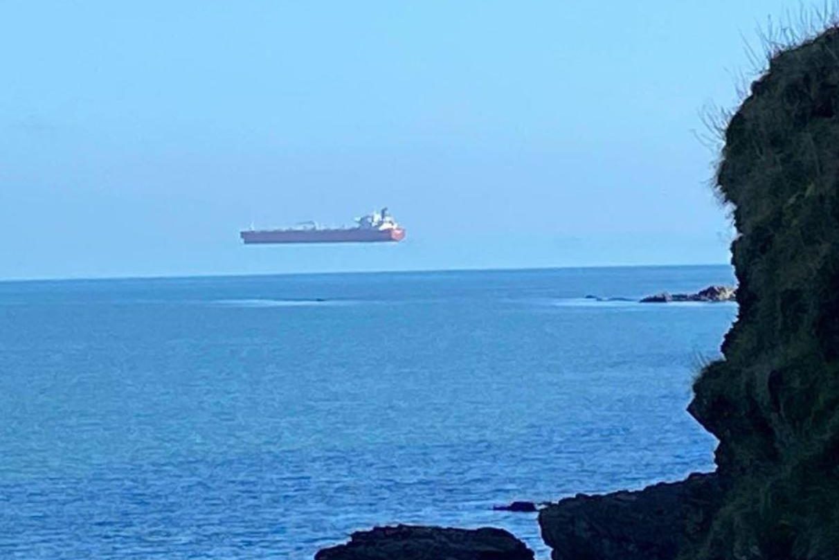 Pedestrian David Morris spotted a large tanker seemingly hovering high above the ocean from a beach in Cornwall recently, U.K. media report.