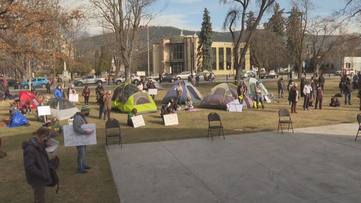 Residents, activists and people experiencing homelessness gathered today at Gyro Park to protest Penticton city council’s decision to deny an extension to a temporary winter shelter.