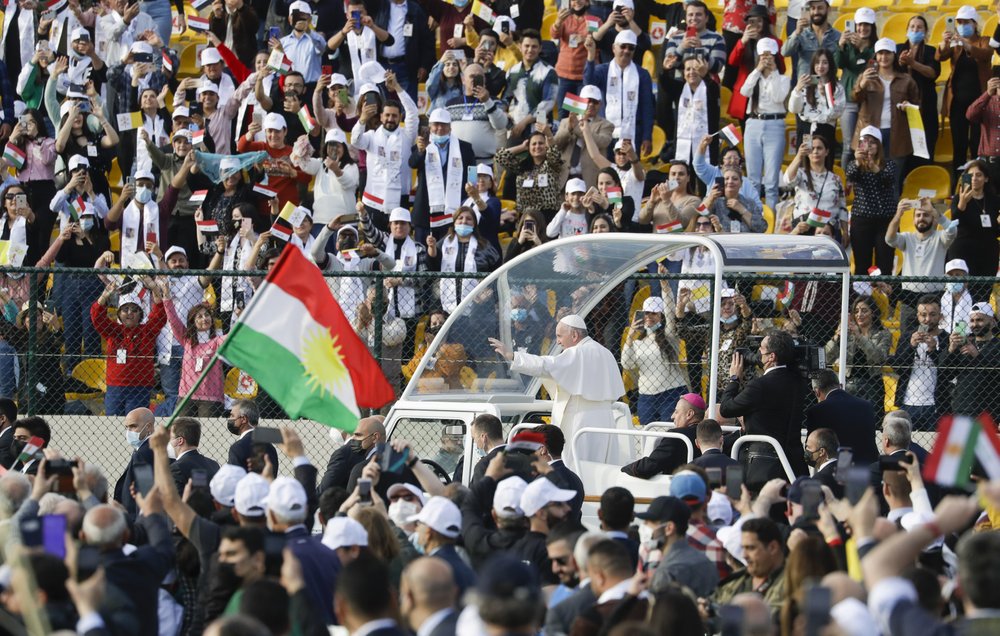 Francis wrapped up the day — and his visit — with a Mass at the stadium in Irbil, in the semi-autonomous northern Kurdish region. An estimated 10,000 people erupted in ululating cheers when he arrived and did a lap around the track in his open-sided popemobile, the first and only time he has used it on this trip due to security concerns.