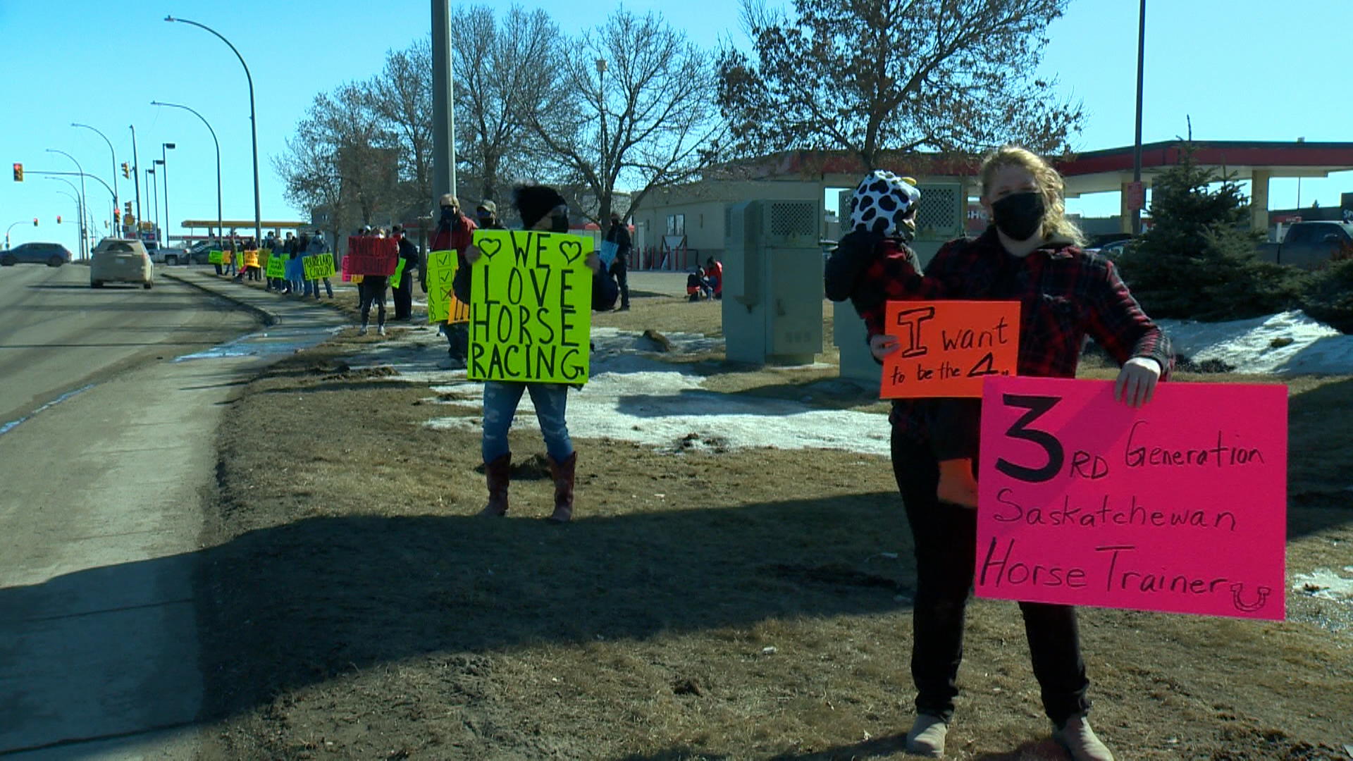 Each person had a sign that signified their position in fighting to keep horse racing alive in Saskatchewan.