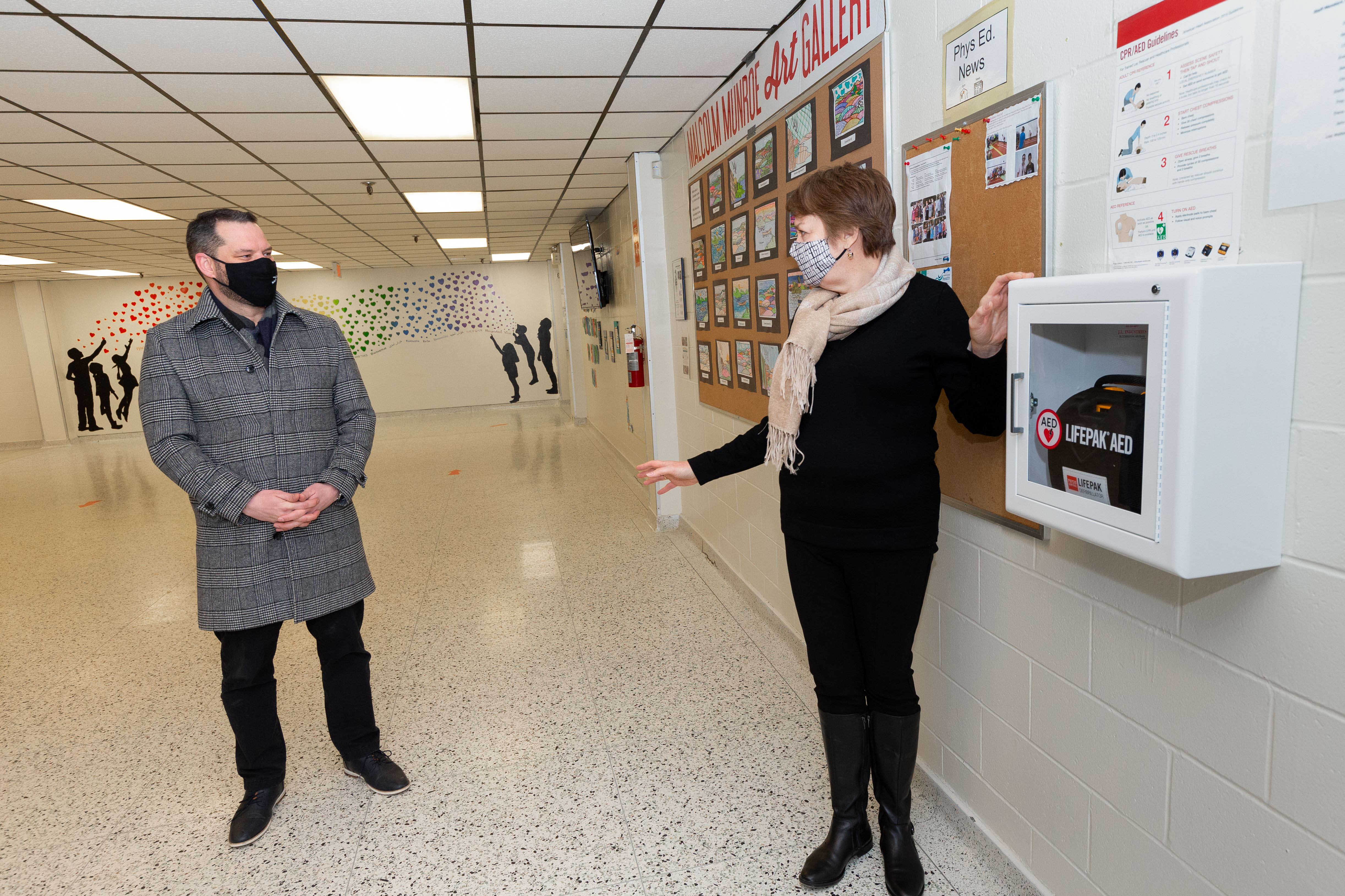 Derek Mombourquette, Minister of Education and Early Childhood Development, and Stephanie Campbell, principal of Malcolm Munroe Memorial Middle School in Sydney, with the school’s automated external defibrillator. Provided/Government of Nova Scotia