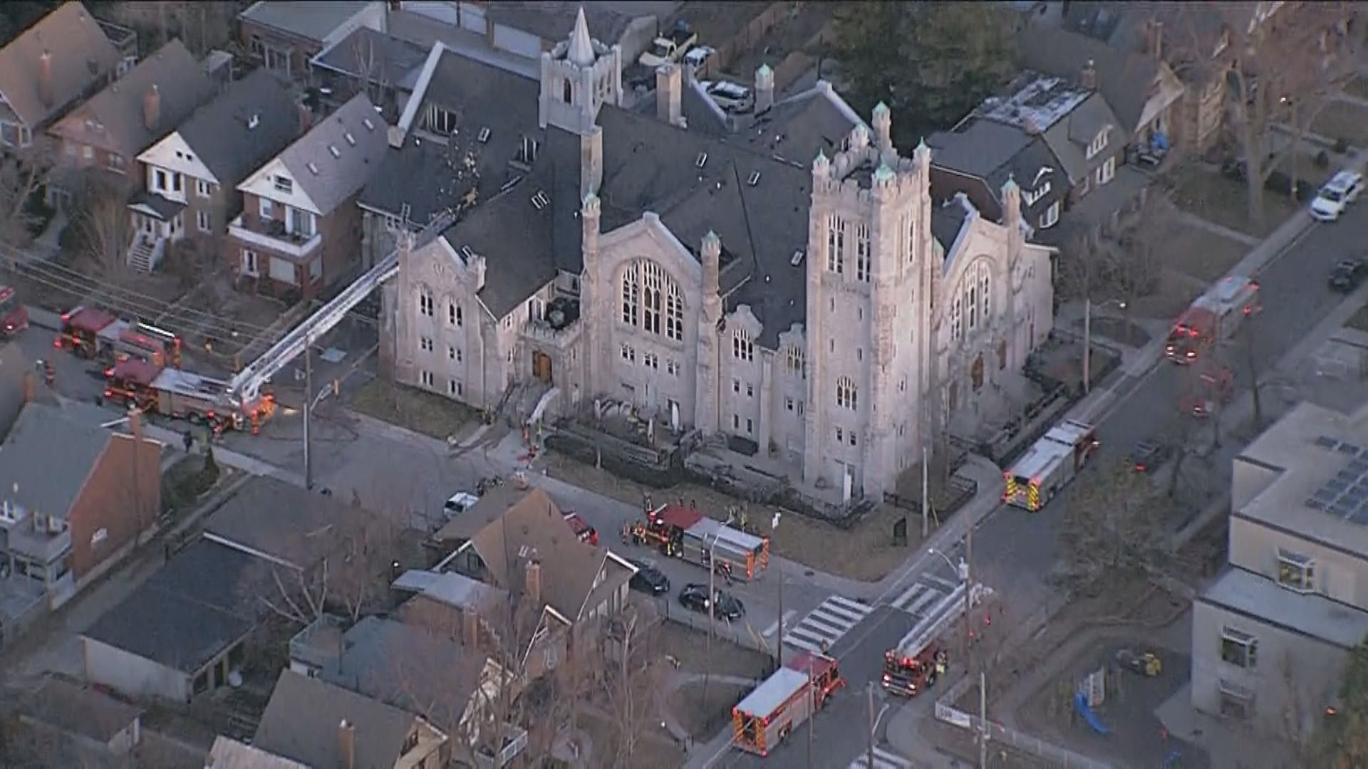 Toronto Fire Services say firefighters are still battling hotspots after a fire broke out at an old church that was converted into condominiums.
