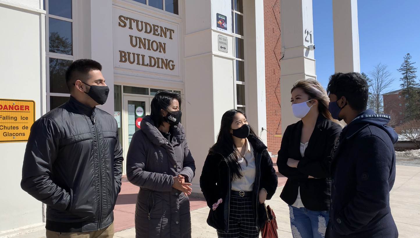 Khanh Do, Jizel Richard and fellow Asian Canadians outside the University of New Brunswick discussing the March 16th attacks in Atlanta, Georgia. Megan Yamoah / Global News
