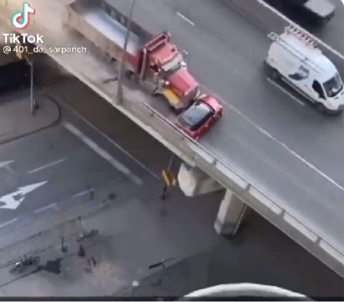 A viral video posted by Const. Scott Matthews from TikTok user @401_dah_sarponch shows the dump truck pushing the sideways Mini Cooper at what appears to be a high speed up the on-ramp and along the Gardiner, leaving a heavy cloud of dust in its wake.