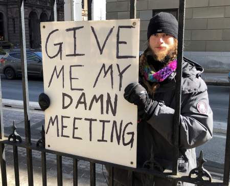 Jacob Fillmore stands in protest outside the Nova Scotia Legislature, just like he’s done for the past 17 days, but now he’s holding up a new sign that reads, “Give me my damn meeting.”