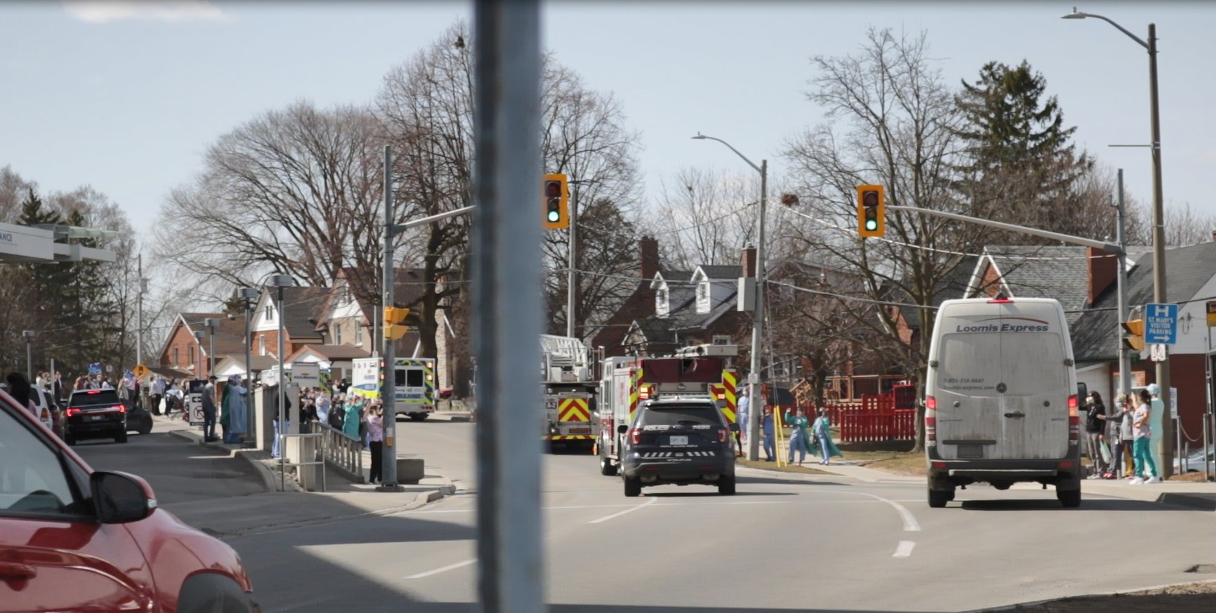 Emergency services paraded with their sirens blaring and lights flashing around hospitals and vaccination clinics in the area on Thursday to honour front-line workers in Waterloo Region dealing with the COVID-19 pandemic.