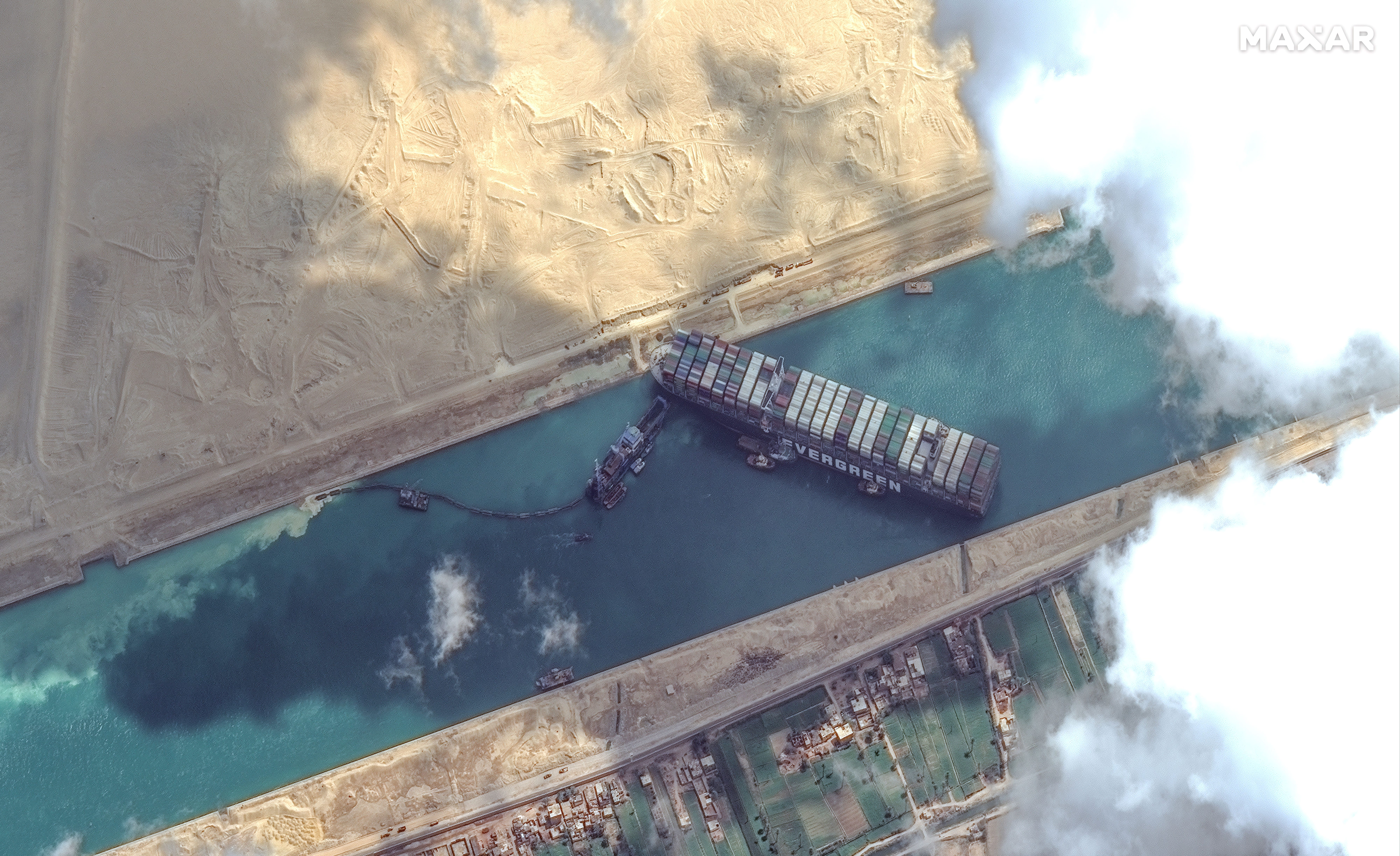 A team from Boskalis, a Dutch firm specializing in salvaging, was working with the canal authority with tugboats and a specialized suction dredger at the port side of the cargo ship’s bow. Egyptian authorities have prohibited media access to the site.