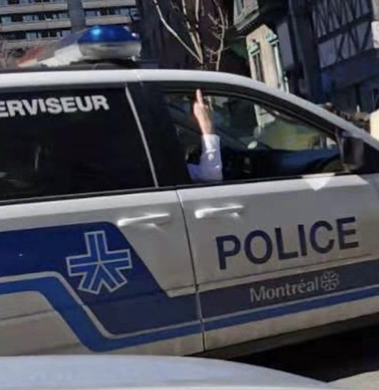 The pictures circulating online since the beginning of the week show an SPVM officer riding in the passenger seat of a police cruiser with his hand resting on the windowsill while appearing to give the finger during the protest.