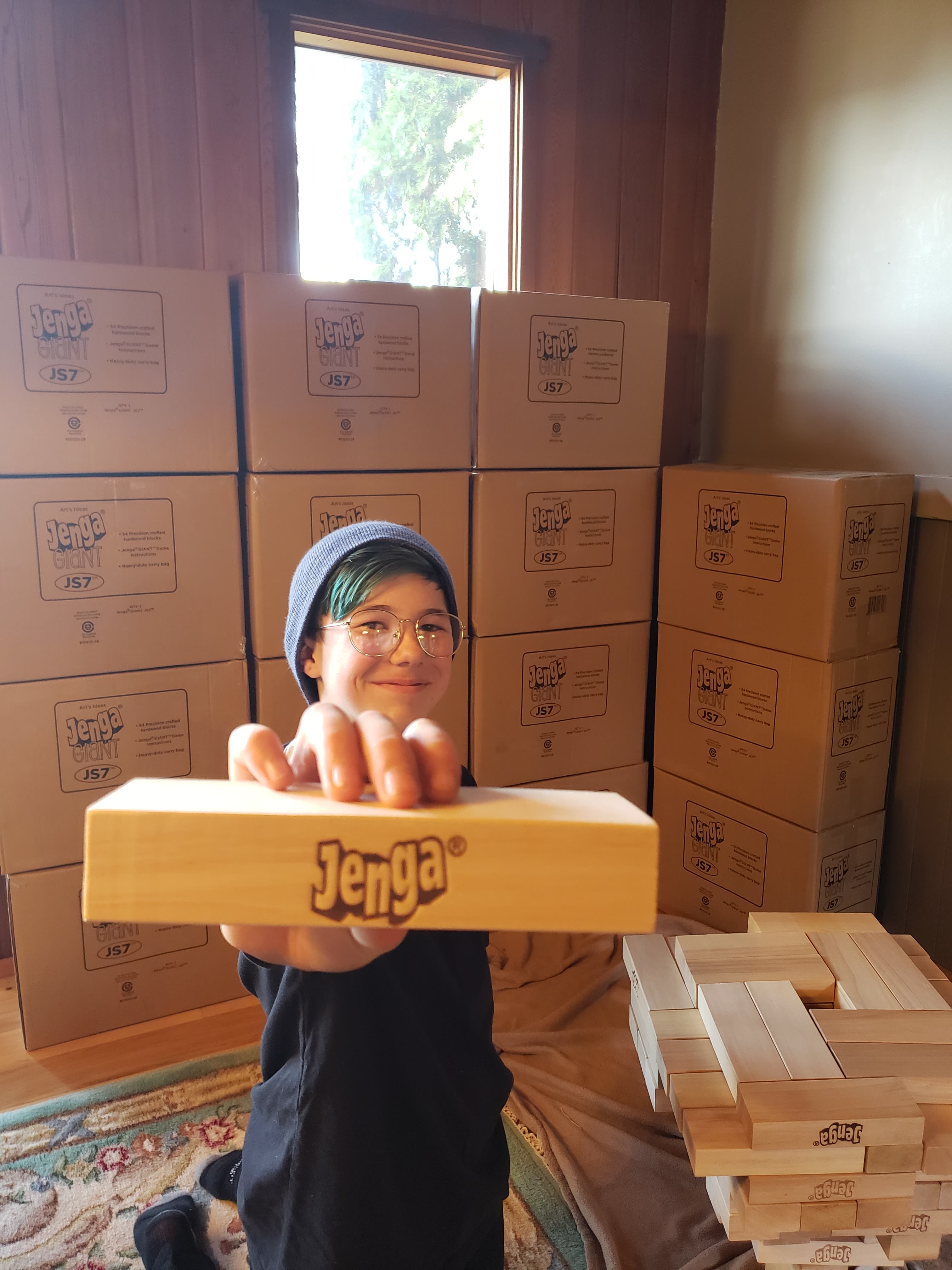 The Giant Jenga sets were a gift from Jenga Giant. He received 24 packs of oversized blocks and two sets that are a little bit smaller and Maxwell is sharing the gift.