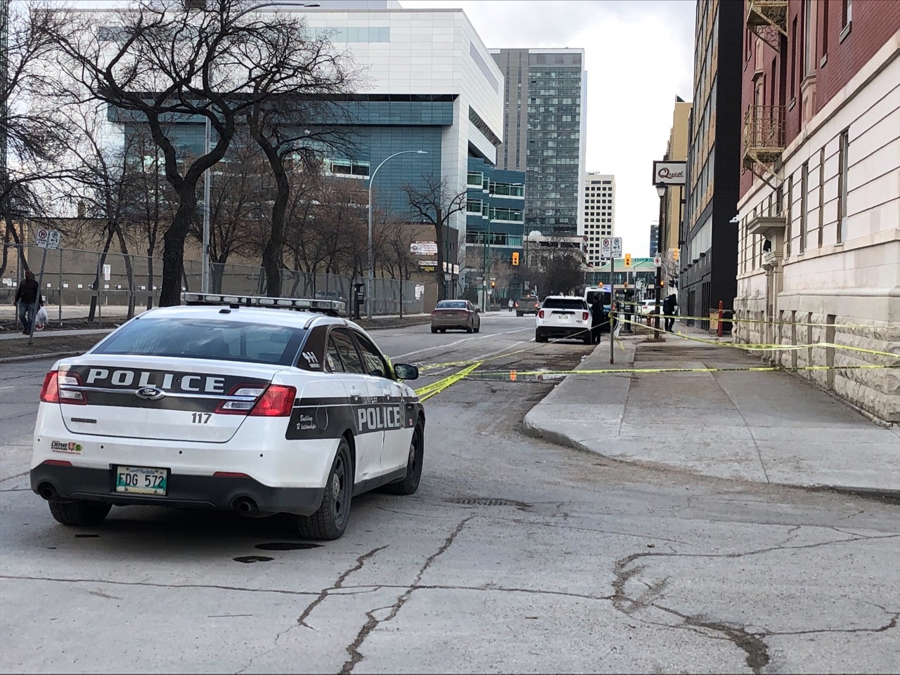 Winnipeg Police are on scene in the area of Carlton Street and Qu’Appelle Avenue Saturday afternoon, blocking a portion of the road.