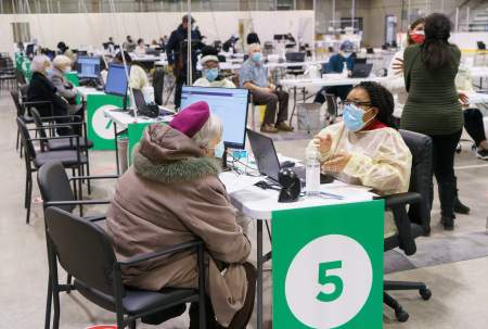Seniors register at a COVID-19 vaccination clinic in a hockey arena in Montreal, on Wednesday, March 10, 2021. THE CANADIAN PRESS/Paul Chiasson