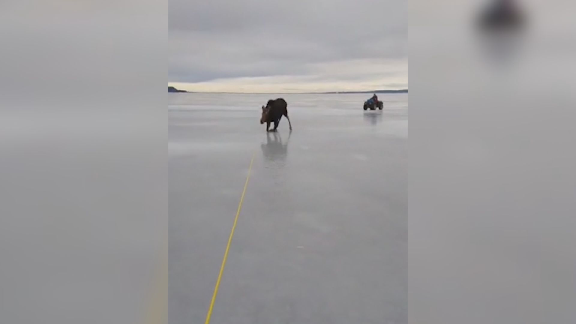 He says he was able to hook two ropes around the rear of the moose as it lay on the ice and then used his ATV to drag it toward shore, where it ambled off into the bush.
