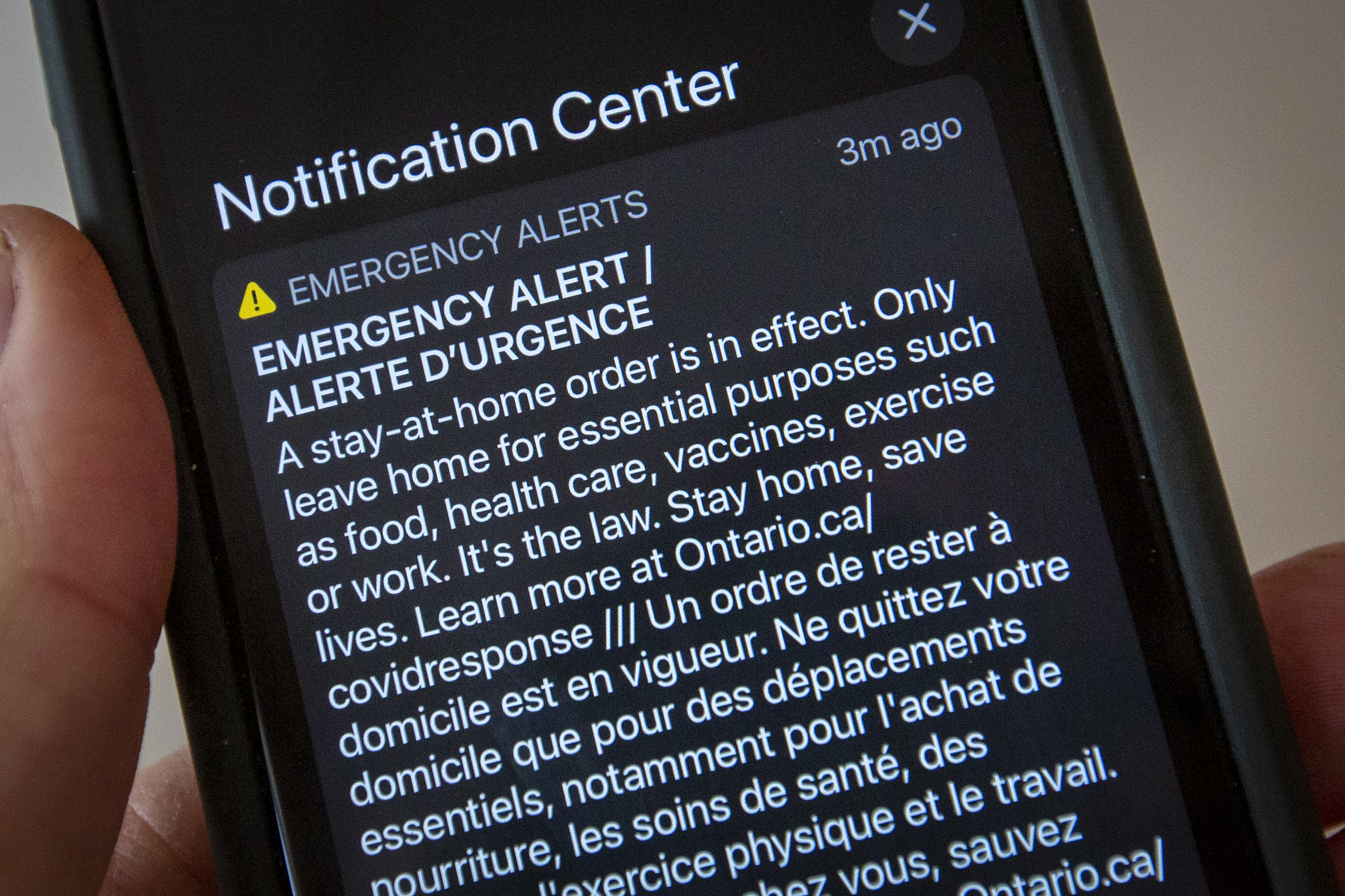 An Ontario-wide emergency alert was issued at 11 a.m. Thursday reminding residents that a stay-at-home order is now in effect amid a surge in COVID-19 cases and hospitalizations.