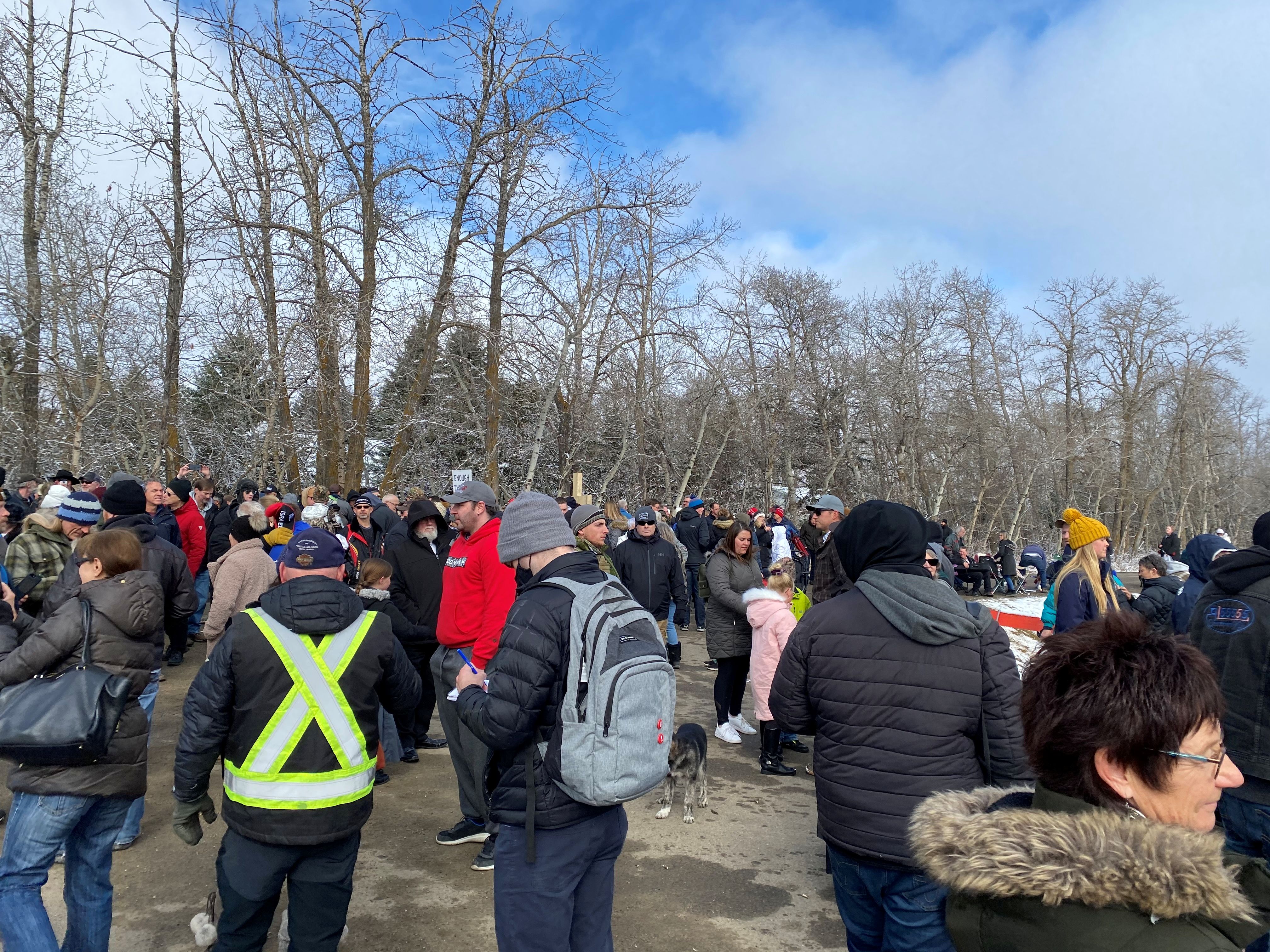 By 11 a.m., around 300 people were outside the church, some singing hymns at times as numerous RCMP officers stood at the roadway leading to the fenced-in church.