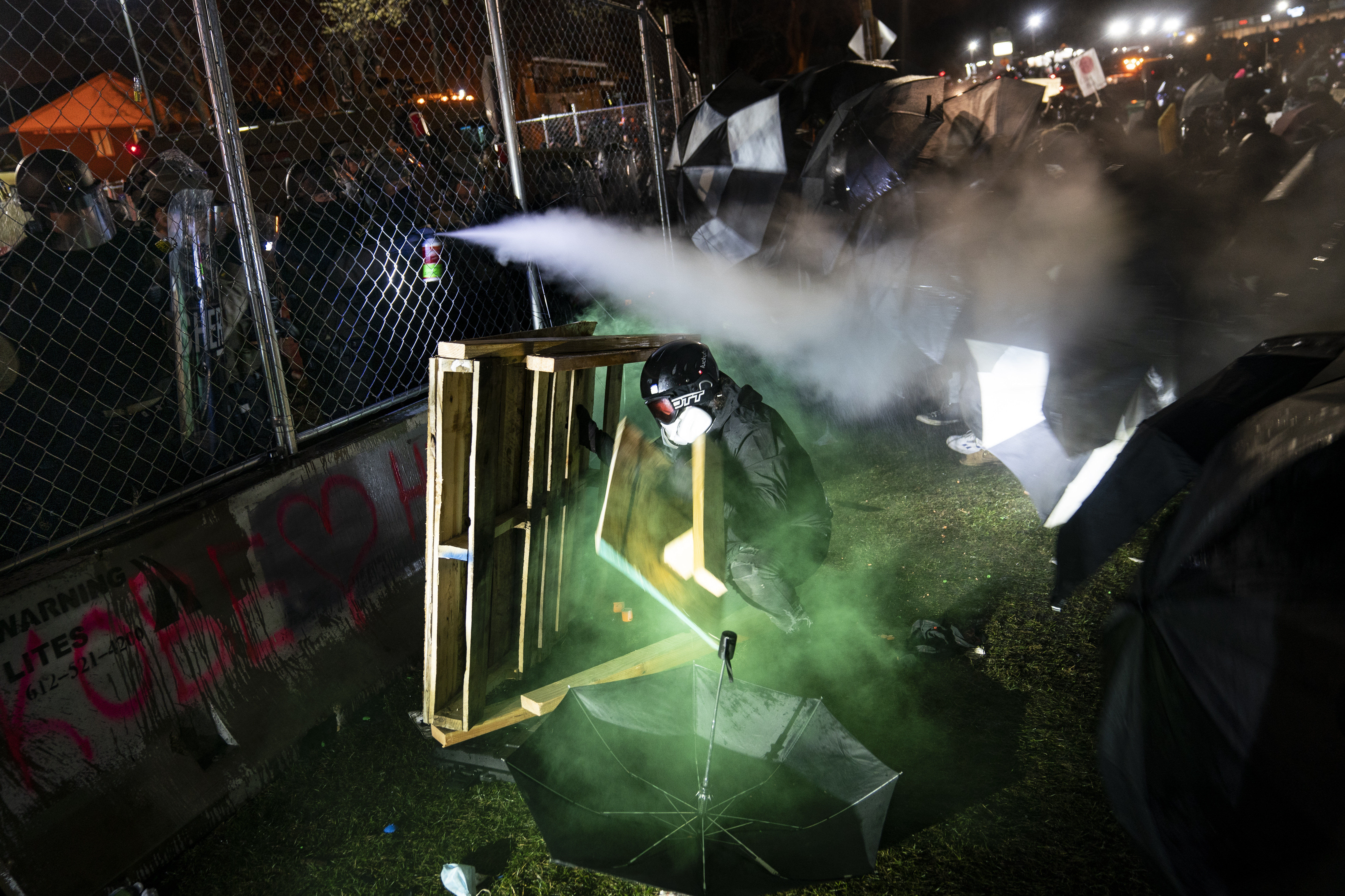 On Friday night, officers fired irritants into a crowd of several hundred after part of an outer fence was opened. Demonstrators dissipated shortly after 10 p.m. when officers quickly advanced. Flash bangs and sponge grenades were fired into the crowd, and several protesters who neared a group of officers were pepper sprayed. Some demonstrators scrambled through yards and over backyard fences to evade a perimeter authorities set up for a block around the police department.