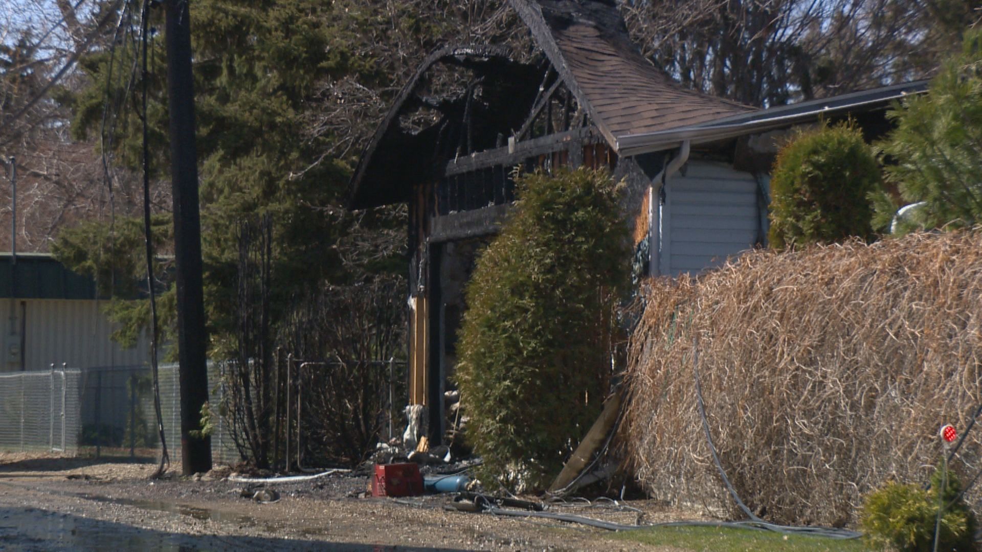 “First arriving commanding officer reported a single detached garage fully involved in fire impinging on a neighbouring home as well overhead power lines arcing,” the fire department said.