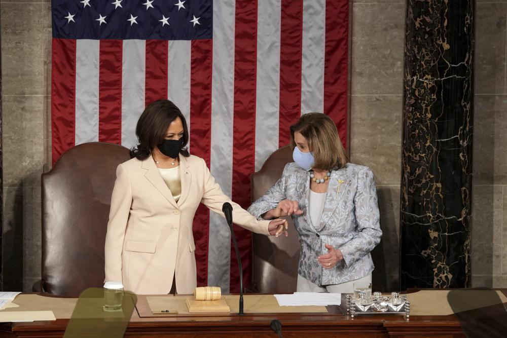 The two began the night with another historic moment: An elbow-bump hello, a pandemic spin on the traditional handshake. Pelosi and Harris stood side by side behind the dais in the House chamber, chatting with each other and occasionally waving to lawmakers as the group waited for Biden to arrive.