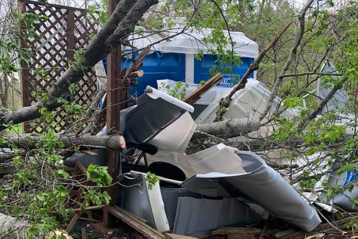 A man had stopped off to relieve himself in the portable toilet a few moments earlier, and the tree ended up hitting his nearby van and the toilet while he was inside.