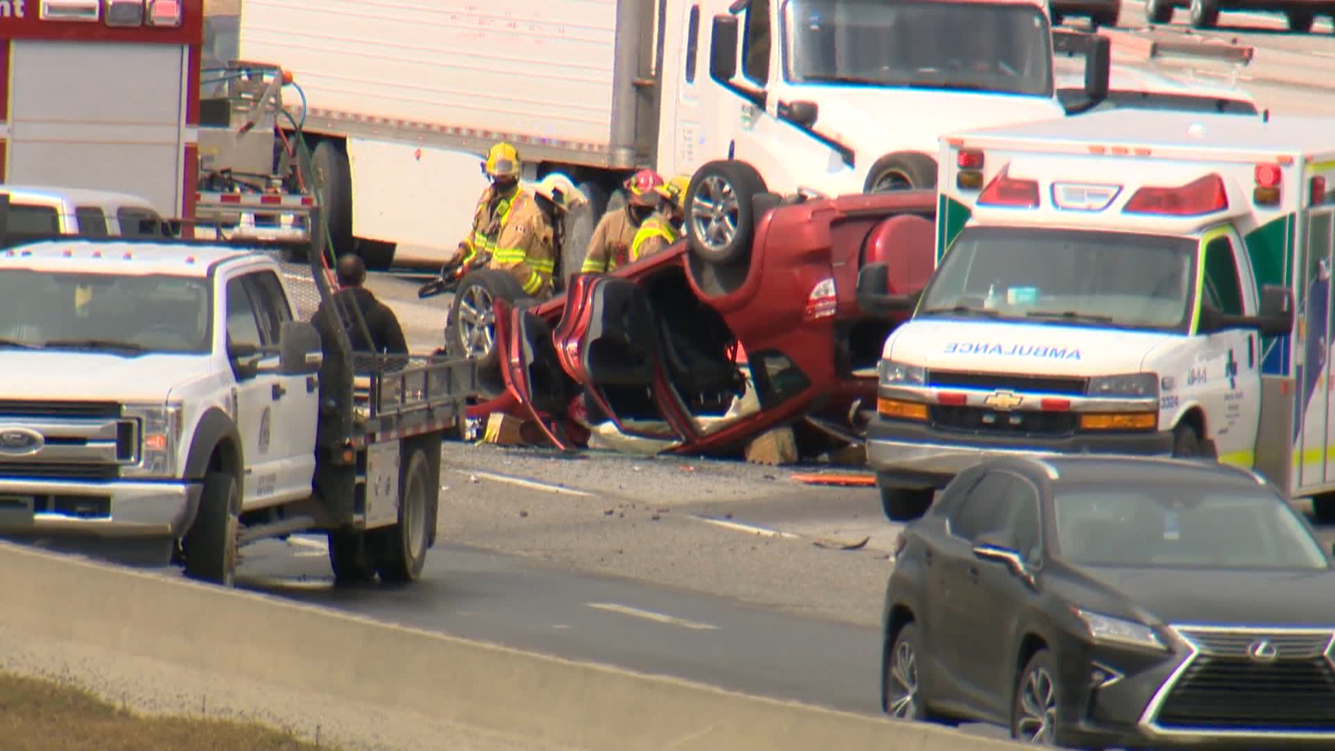 The crash happened at about 3:15 p.m. on southbound Deerfoot Trail just north of the 8 Avenue N.E. overpass, EMS said.