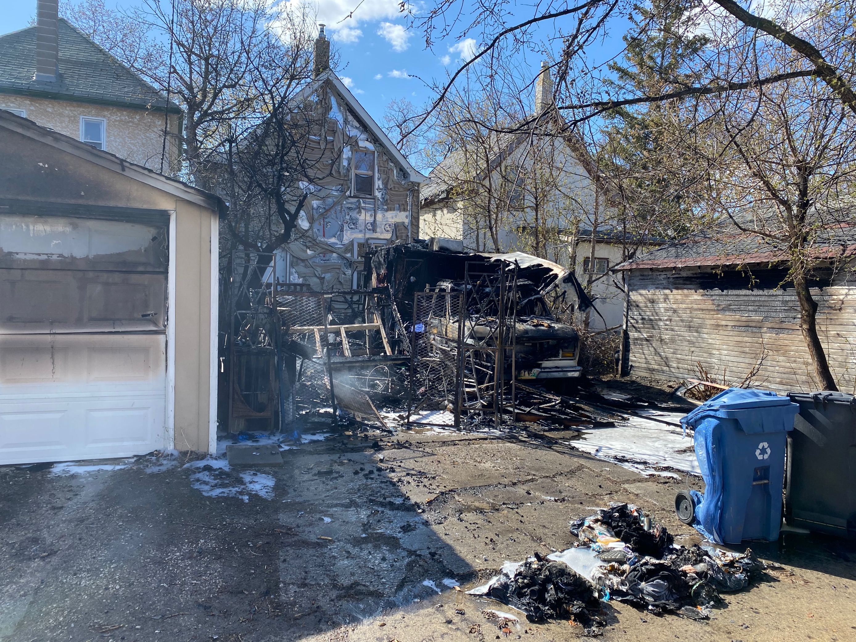 At 4:23 p.m., the fire was out, but the garage was destroyed and the neighbour’s house had heat damage. No one was in either structure at the time of the fire.