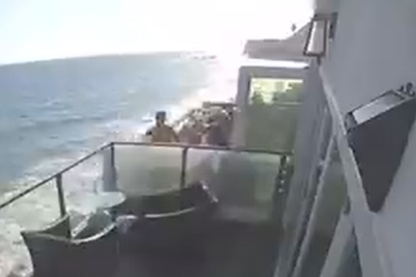 Video shows more than a dozen people were crammed onto the balcony when it gave way around 5:30 p.m. on Saturday. People, furniture and shattered wood were smashed on the rocky beach below. Only a few people managed to avoid going down with the balcony, the video shows.