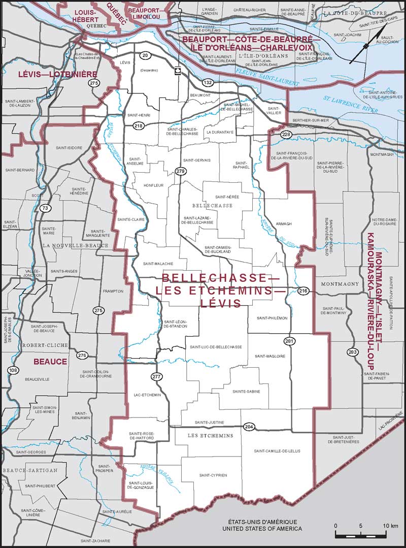 Bellechasse—Les Etchemins—Lévis is located between Quebec City and the Canada-U.S. border.