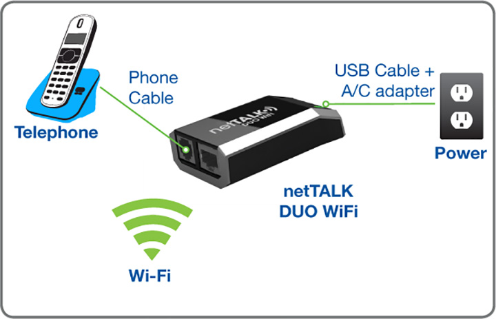 The system can memorize numerous WiFi environments so it simply works when you revisit memorized hotspots. A reminder you will need a wall outlet for the netTALK Duo WiFi for it to work.