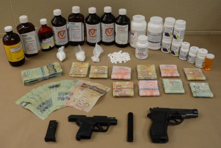Police also seized a loaded handgun, a pellet gun, a bulletproof vest, about two ounces of cocaine, dozens of pills and prescription syrups, and a large amount of cash, some of which was counterfeit.