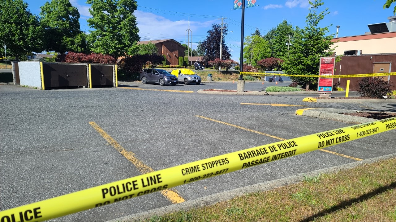 Mounties said a man was found dead in a parked vehicle from apparent gunshot wounds. A silver SUV could be seen partially covered by a tarp behind police tape.