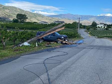A utility pole was destroyed and power was temporarily disrupted, say Osoyoos RCMP, following a single-vehicle collision on Friday morning.
