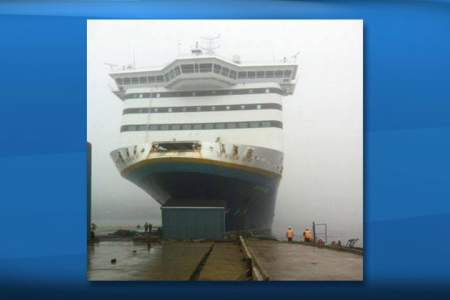 The Blue Puttees was in drydock in Halifax after it damaged its bow when it ran aground in thick fog on July 31 while trying to leave Port aux Basques, N.L., for Cape Breton.