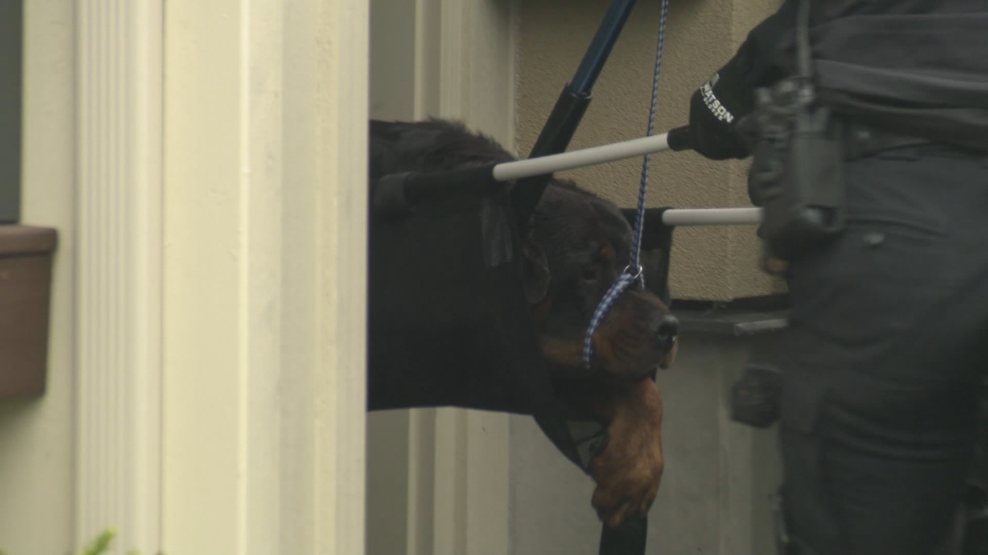 The dog, a Rottweiler, was eventually tranquillized and carried out of the home.