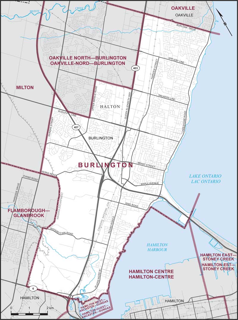Bridging Oakville and Hamilton, the Burlington riding consists of the southern half of the city of Burlington.