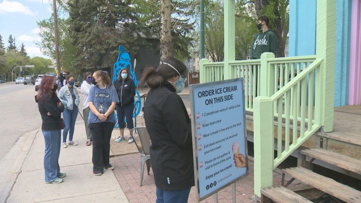 Dessart Sweets in Regina’s Cathedral neighbourhood saw lineups early and often Thursday, with many customers saying they came out for a cold treat in response to a video showing an encounter between store staff and a group of anti-maskers Wednesday.