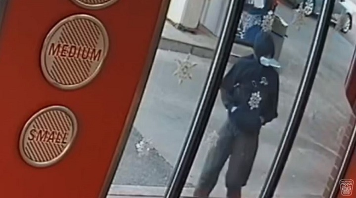 The suspect can be seen wearing a dark sweater with a hood on. He was wearing a mask and grey jogging pants.