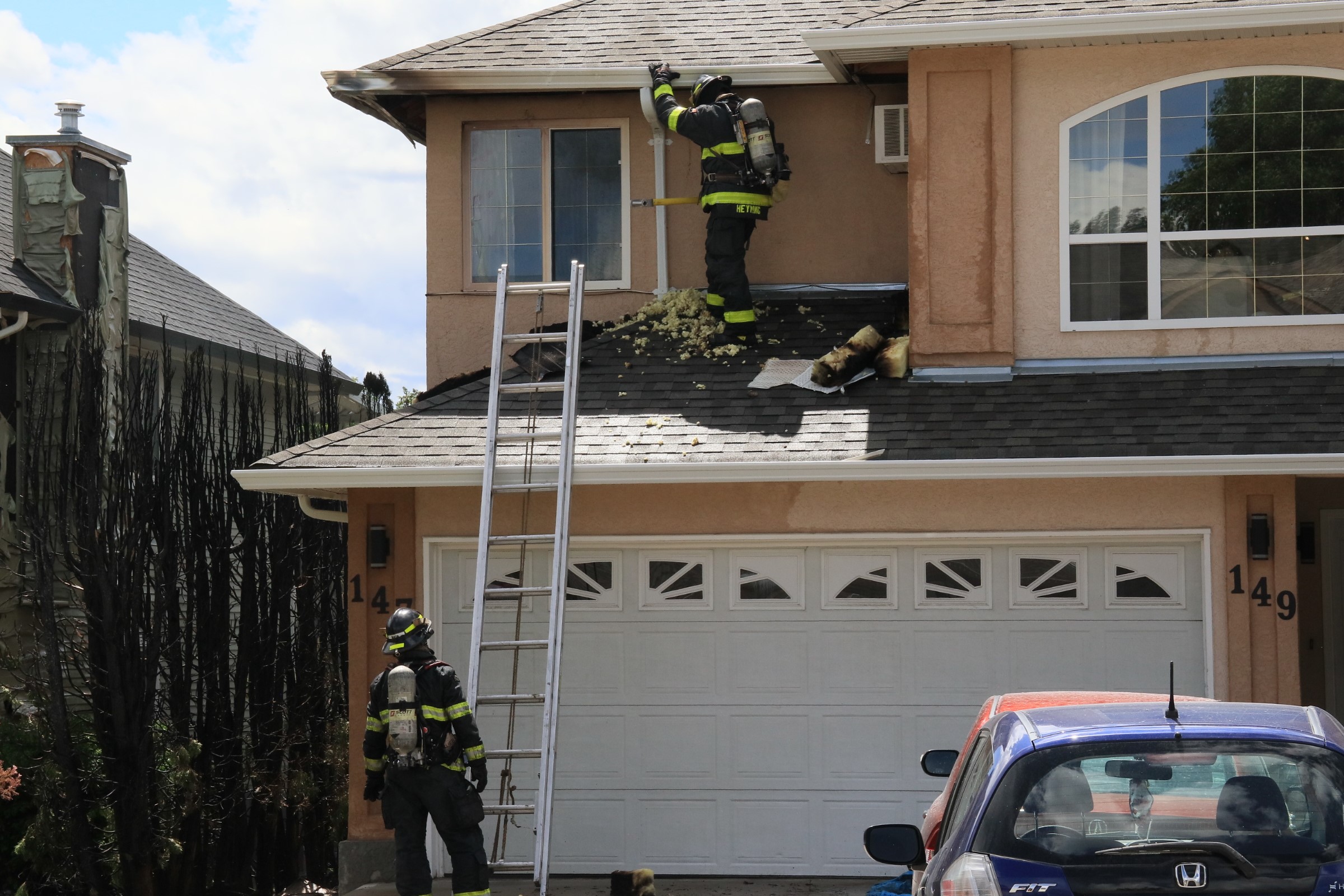 Firefighters inspect soffits of a house along Wyndham Crescent in Glenmore following a hedge fire on Saturday. Randy Millis